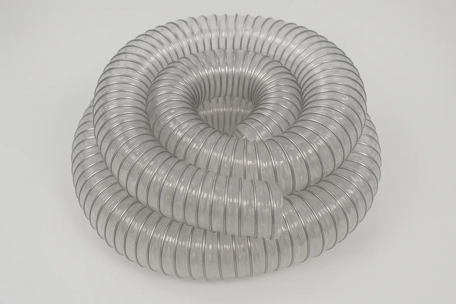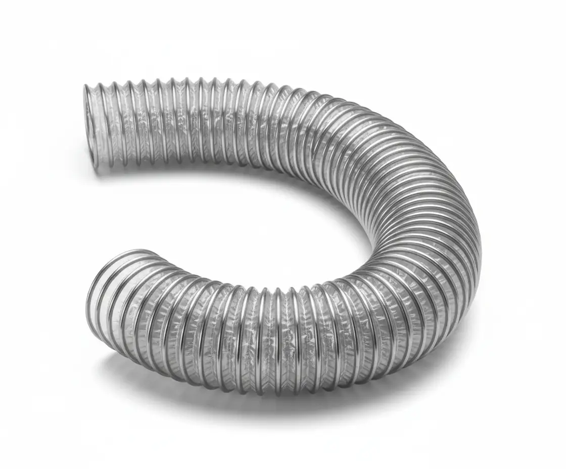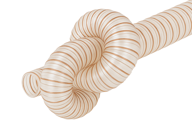 Mangueira em poliuretano cristal, com espirais encapsulados (aço cobreado, zincado, inox ou polietileno), oferecendo alta resistência à abrasão e longa durabilidade – até 5x mais resistente que o PVC. Adequado para sucção e descarga de materiais abrasivos, fumaça, vapor, cavacos de madeira e muito mais.